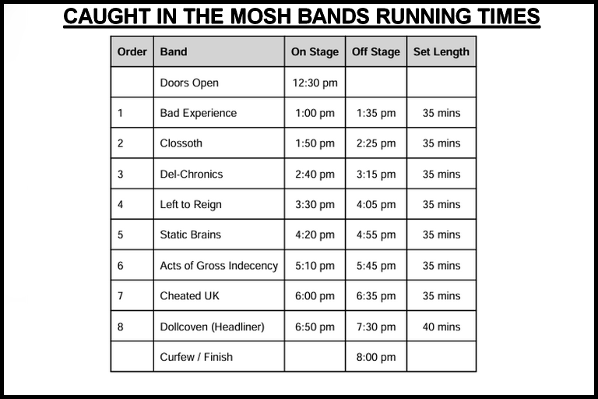BANDS RUNNING TIMES BELOW LAST GIG OF 2025